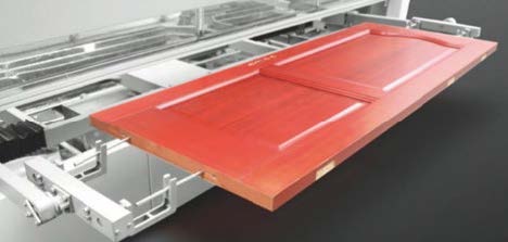 На рабочей руке устанавливается два пистолета, ход по вертикальной оси составляет до 350 мм. Держатели для пистолетов могут быть спозиционированы под различные углы, в зависимости от различных форм-факторов заготовок. Распыление может производиться как на пласть заготовок, так и по торцам.