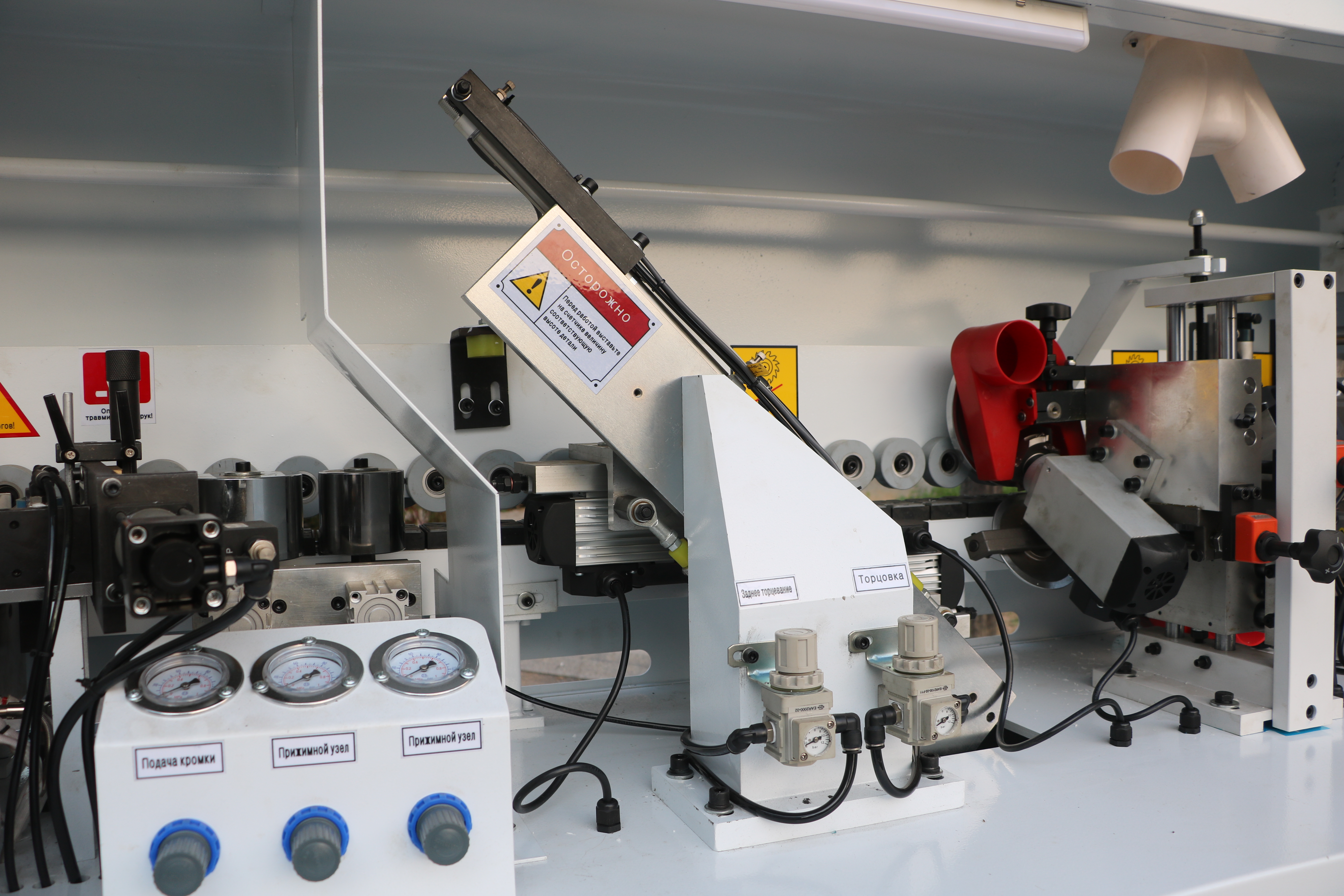 Прижимной блок с пневматическим управлением оснащен одним основным и одним полноценным допрессовочным роликом, давление на ролики может регулироваться в зависимости от типа используемой кромки и деталей