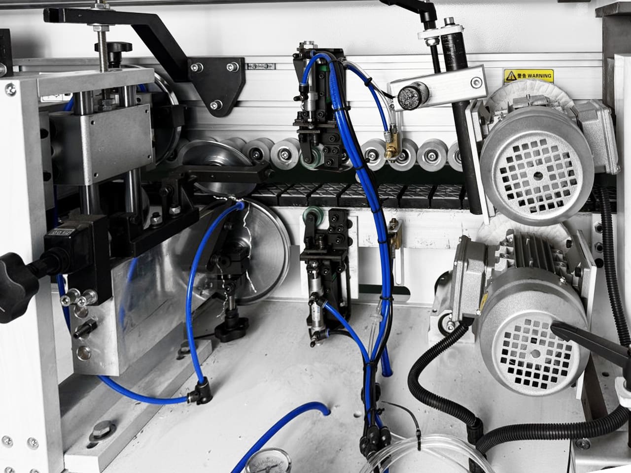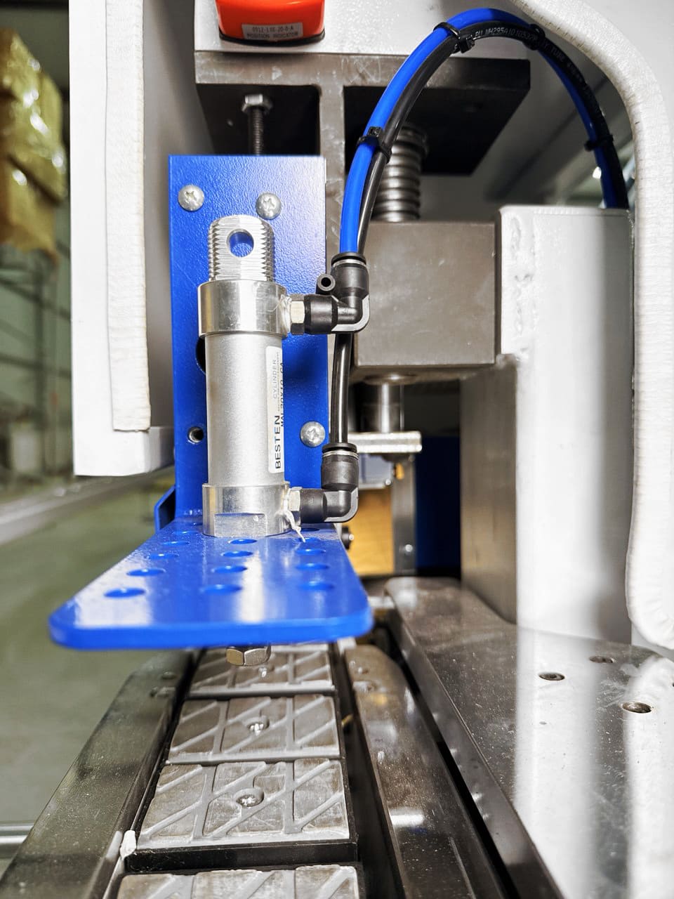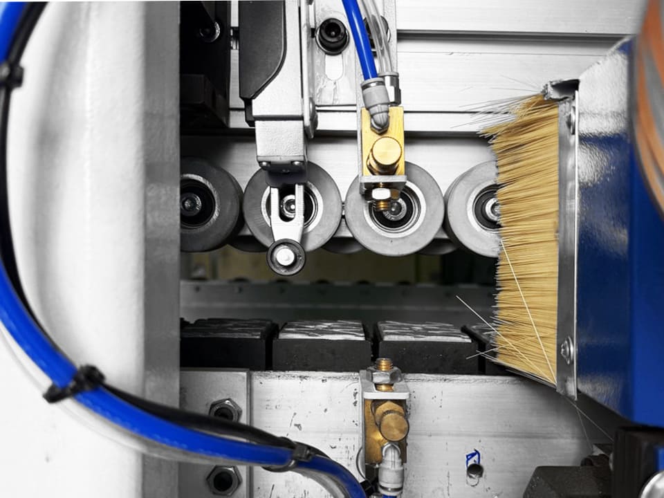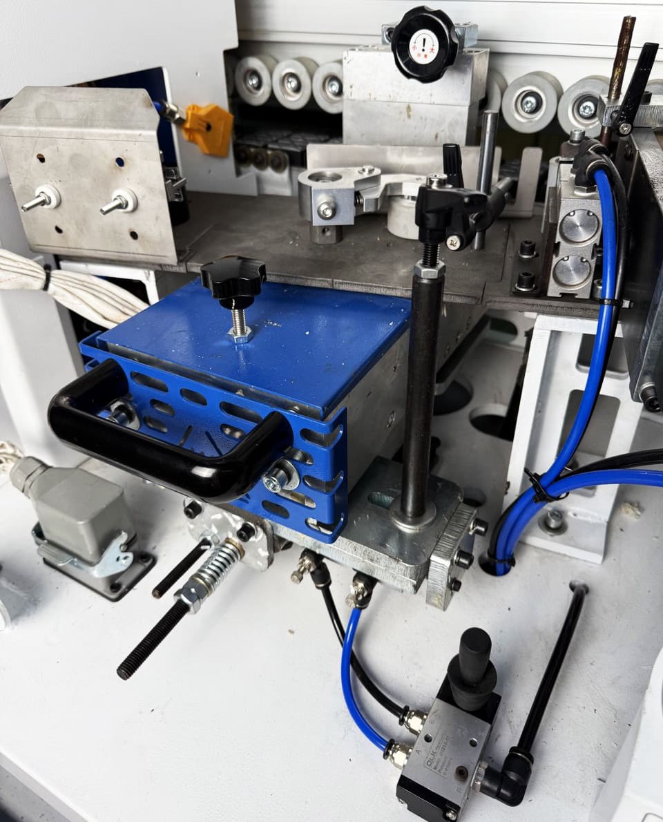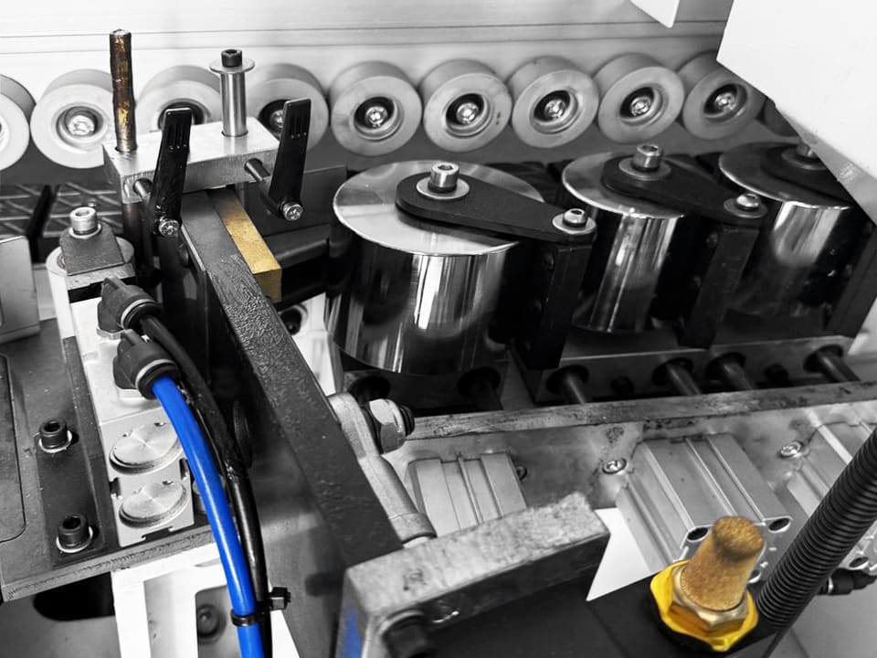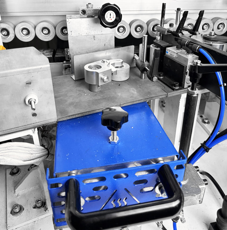 Прижимной блок с пневматическим управлением оснащен одним основным и двумя допрессовочными роликами со скребками, давление на ролики может регулироваться в зависимости от типа используемой кромки и деталей. Каждый ролик оснащен индивидуальным пневмоцилиндром.