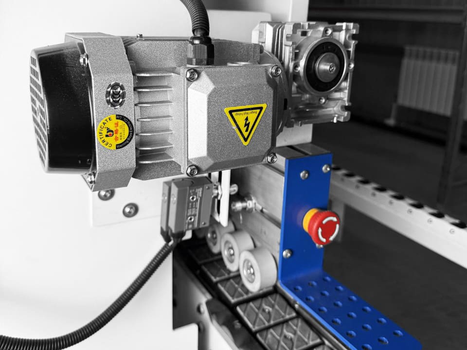 Прижимная траверса изготовлена из специального профиля с установленными обрезиненными роликами и позволяет регулировать высоту подъёма от 8 до 55 мм. Регулируется с пульта на необходимую высоту с помощью электромотора.