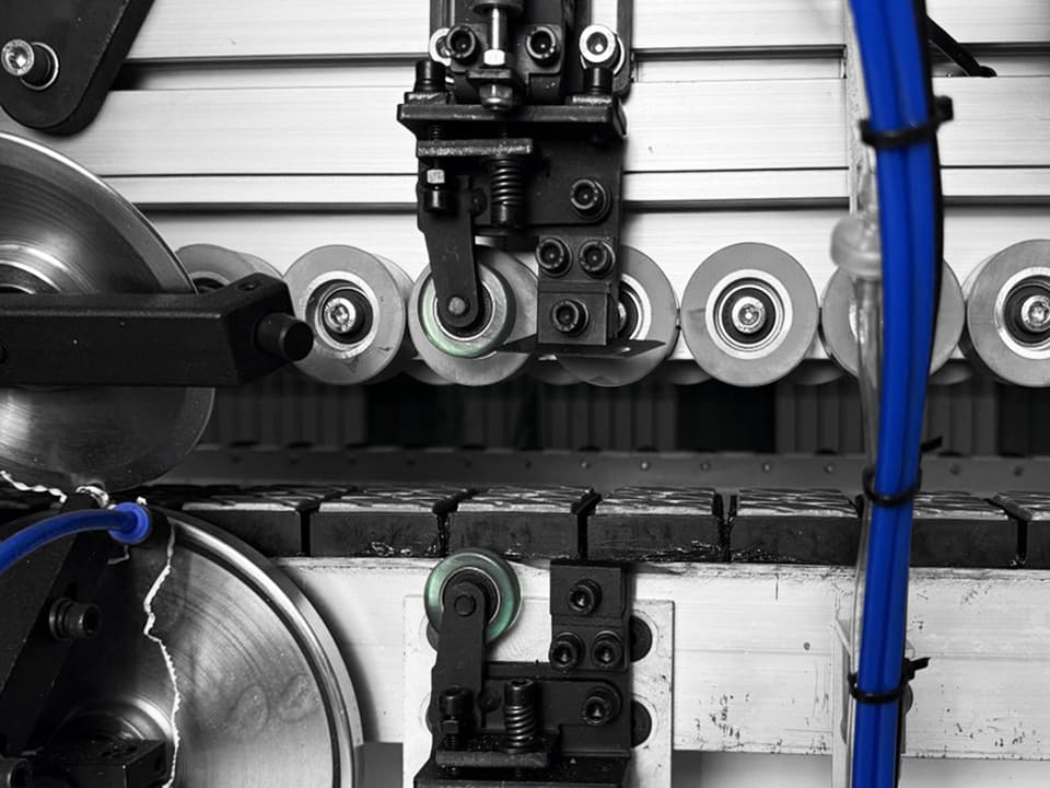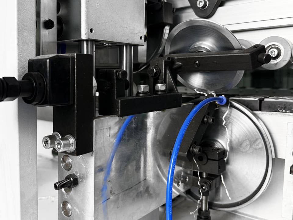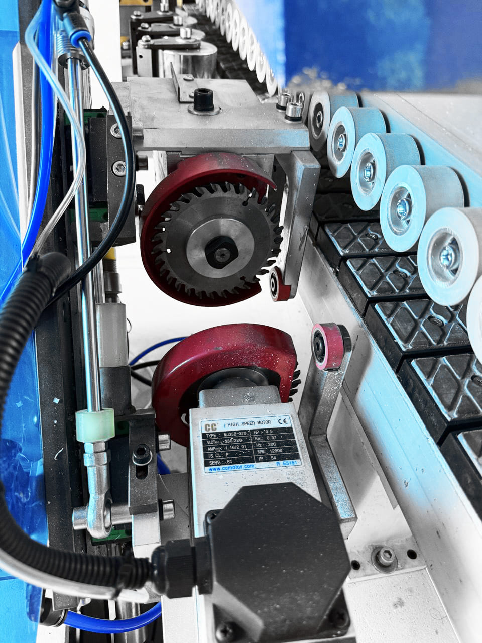Боковой прижимной ролик с пружинным механизмом и системой об-ратного стопора надежно фиксирует кромочный материал, предотвращая обратный ход кромки в сторону рулона.