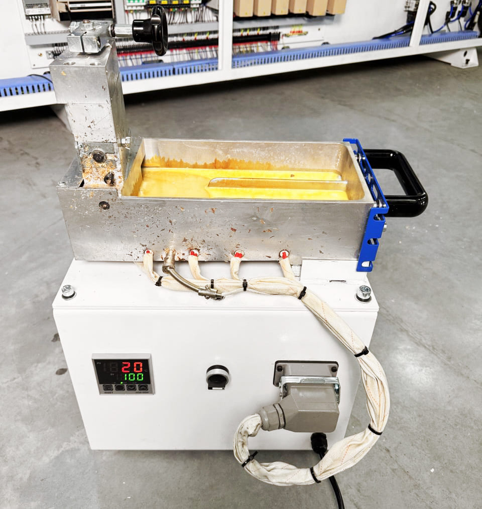Входит в стандартную комплектацию станка. Представляет собой станцию для обслуживания клеевой ванны с термоконтроллером напряжения 220 В. Может быть установлено в любом удобном месте, позволяет быстро и качественно произвести чистку либо замену клеевого материала.