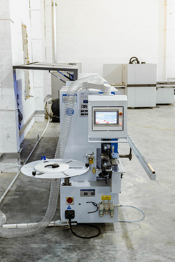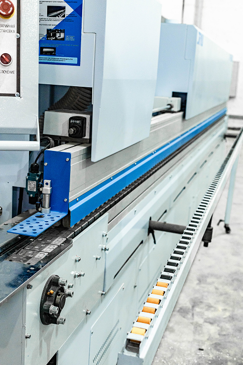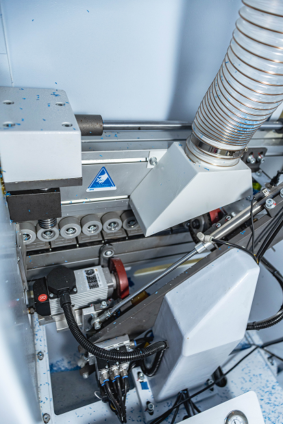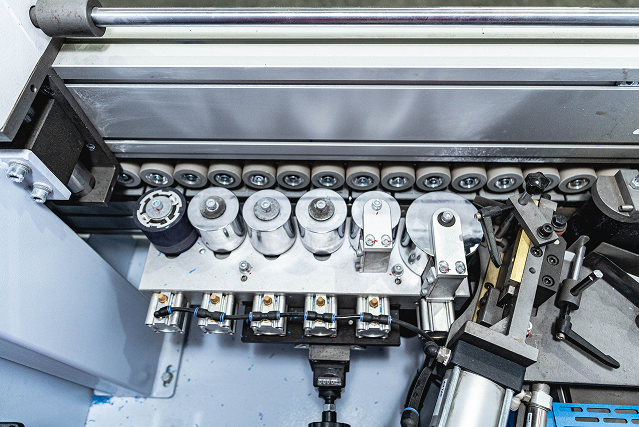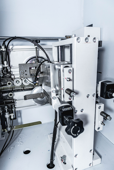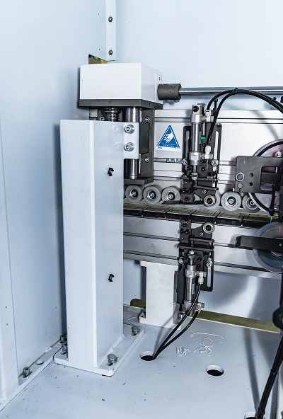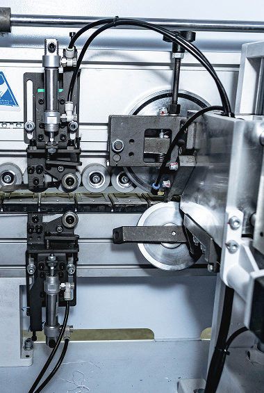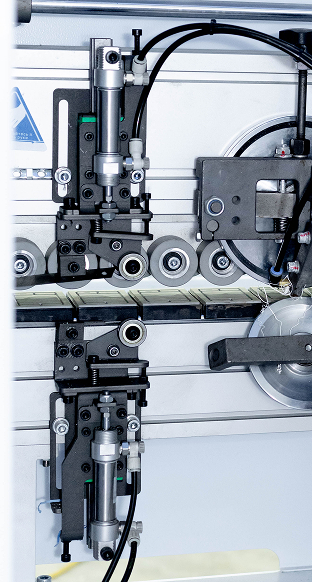 Узел подачи кромки точно и деликатно подает кромочный материал в зону приклеивания, обеспечивая минимальный свес кромки в начале детали. Может работать с рулонным кромочным материалом толщиной от 0,4 до 3 мм и с полосовым кромочным материалом.