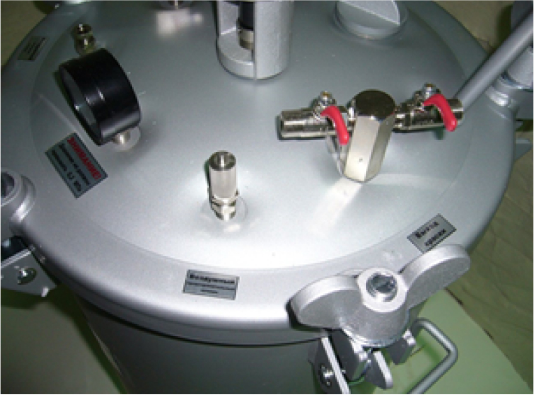 (На фото слева внутренняя емкость, пневмо-мешалка и фильтр грубой очистки. На фото справа предохранительный клапан, манометр, кран на подачу материалла)