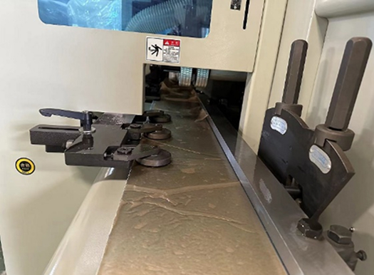 Боковые прижимы на входе в станок и напротив правого вертикального шпинделя фиксируют заготовку и препятствуют ее смещению при обработке.
