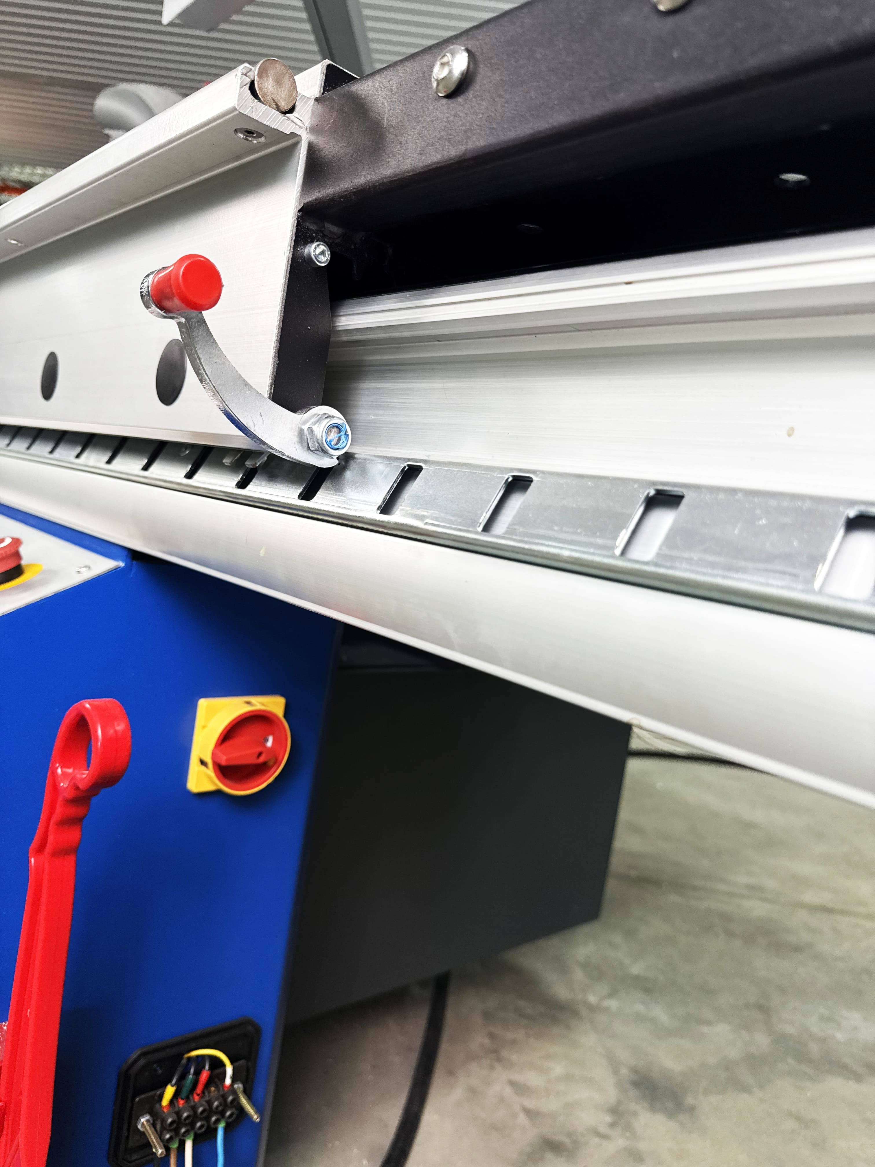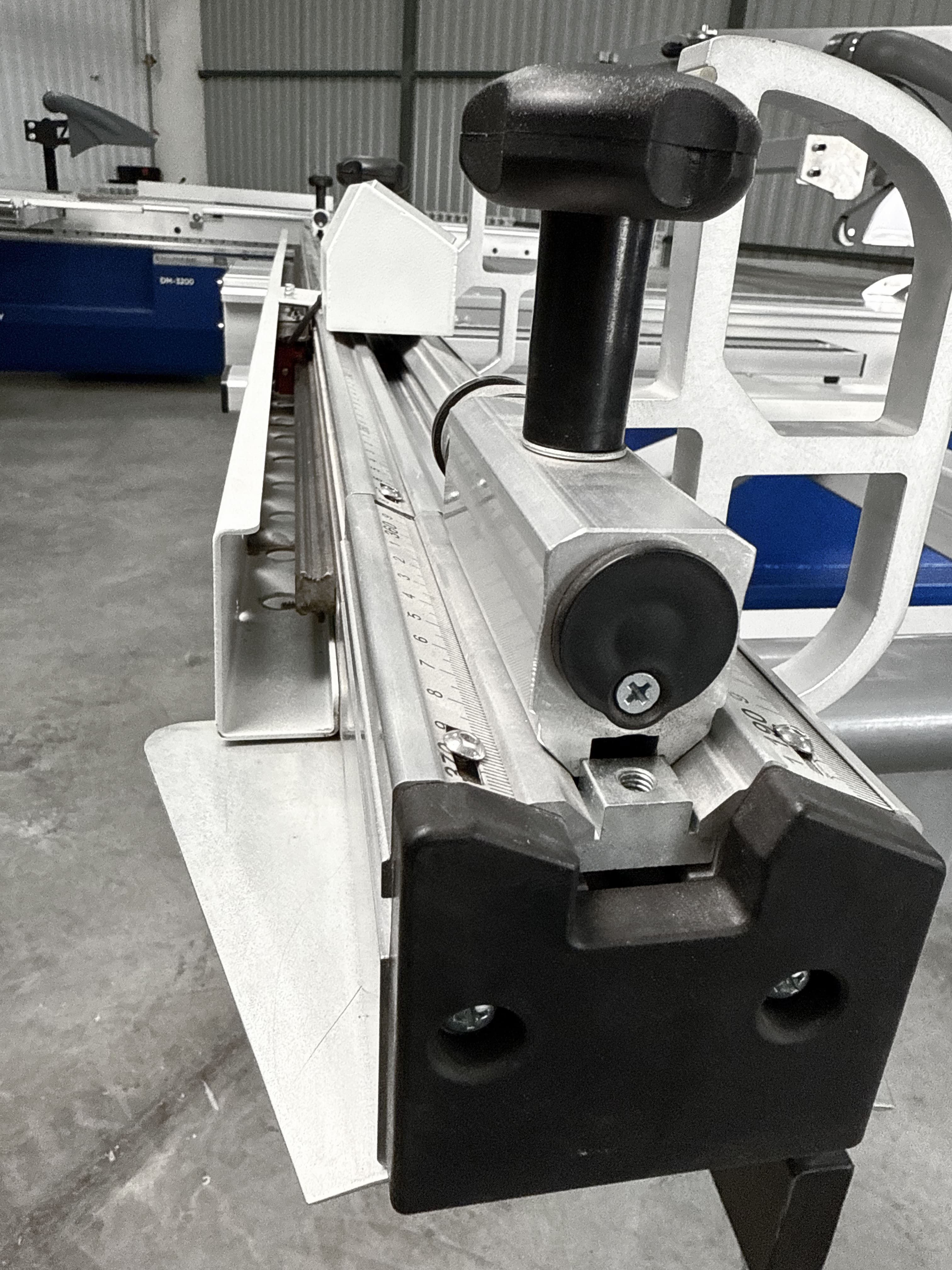 Перемещение перекидного упора осуществляется с помощью линейного подшипника на призматической направляющей, данная система крепления придает конструкции безупречную плавность хода, жесткость и как следствие отсутствие люфтов, что гарантированно обеспечивает точное позиционирование.