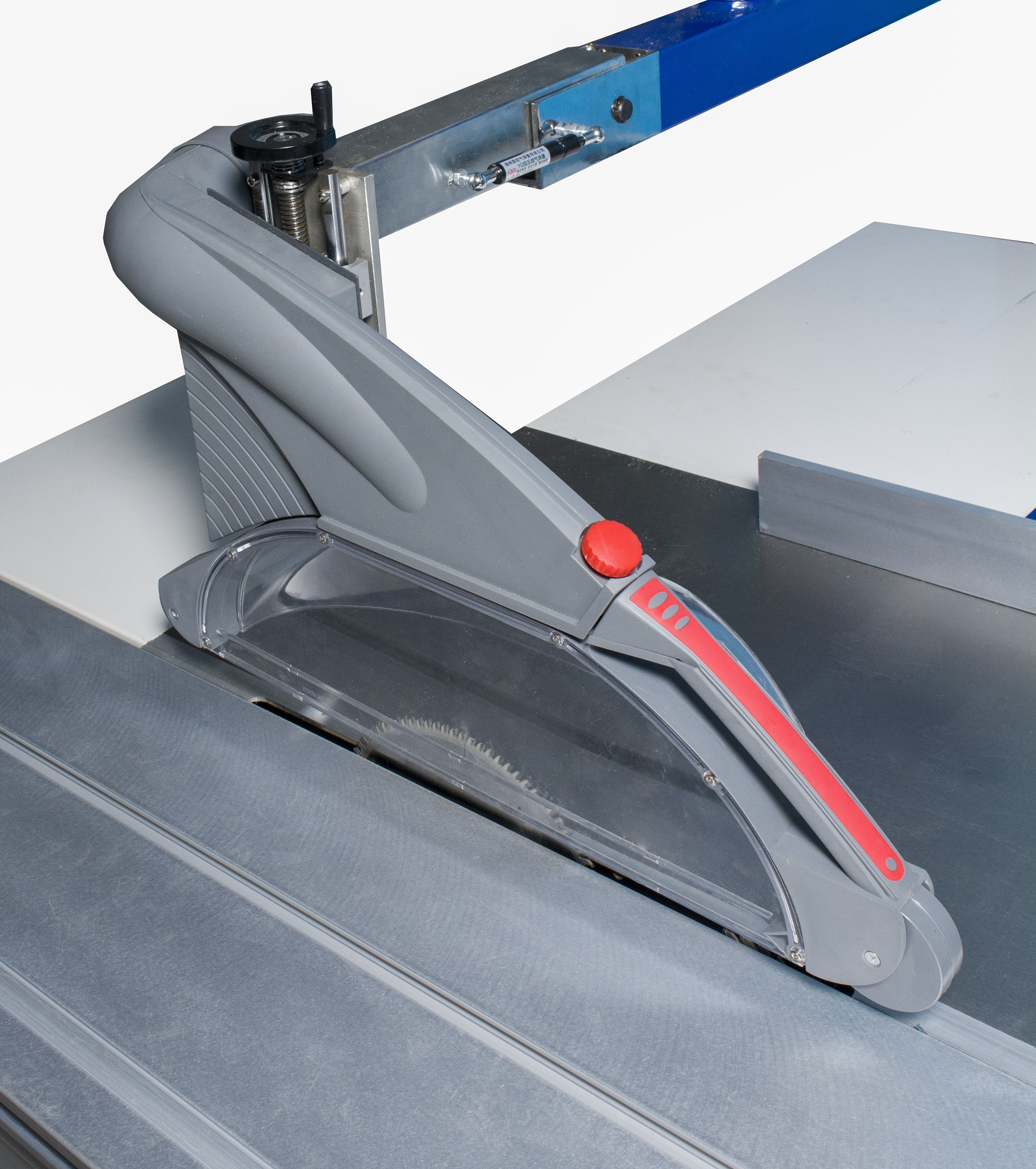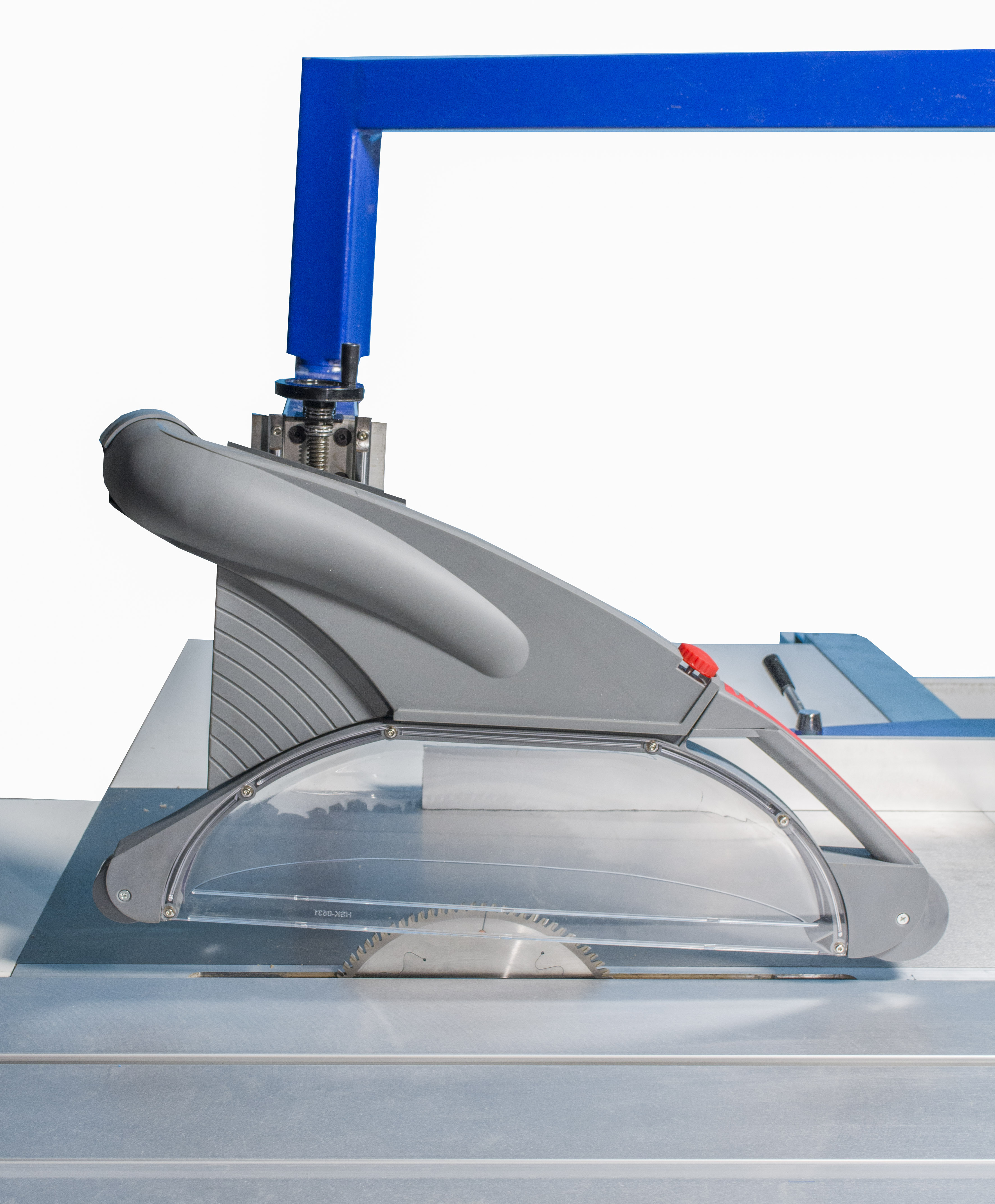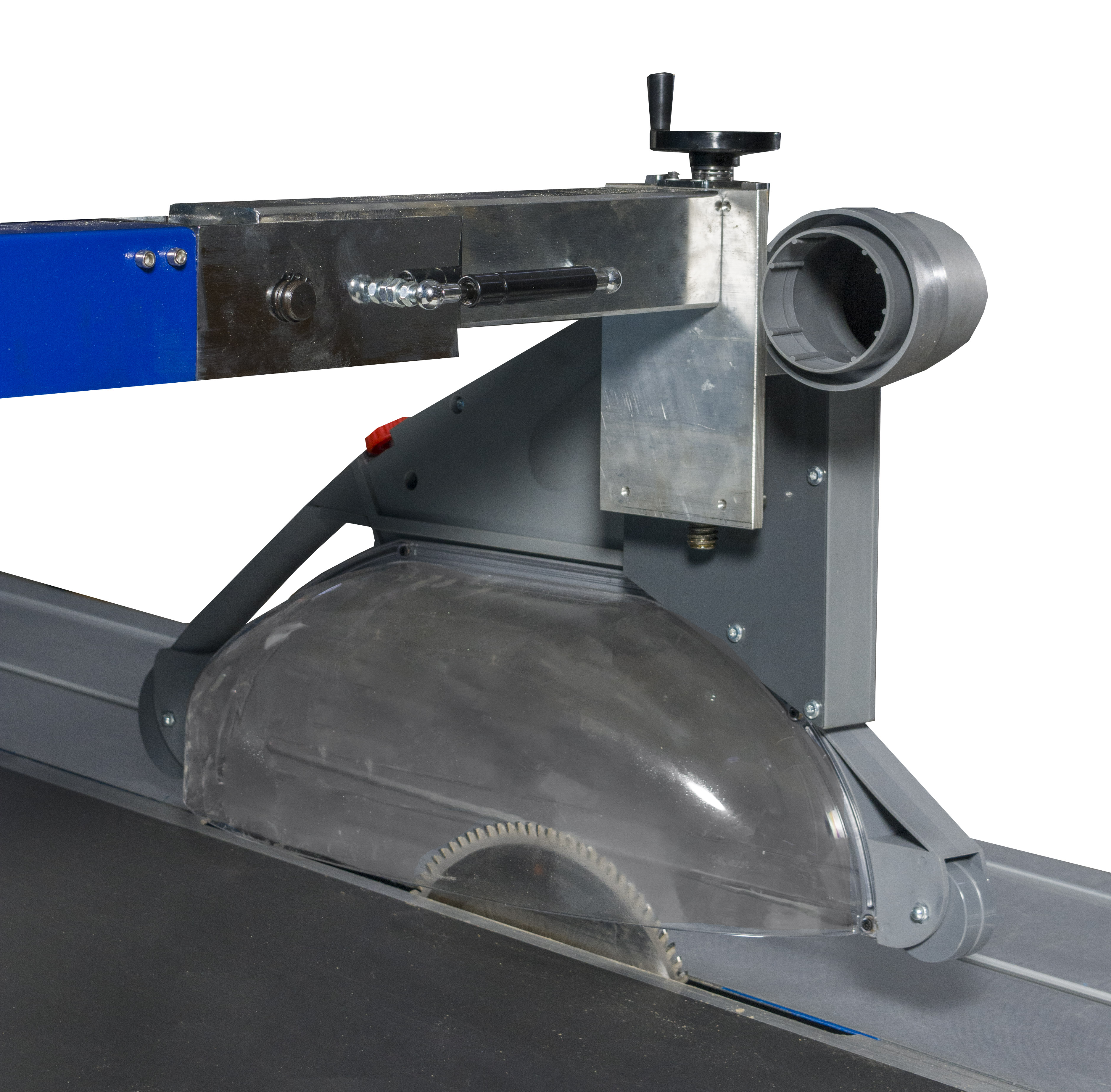 В стандартную комплектацию станка входит большой защитный кожух пил. Кожух имеет возможность регулировки высоты над рабочим столом, может быть легко поднят, когда он не нужен, имеет увеличенный диаметр аспирационного патрубка – 100мм и закрывает всю область распила.