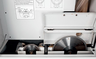 Пильный блок на массивных направляющих оснащен раздельными приводами основного (18 кВт) и подрезного (2кВт) пильных дисков.