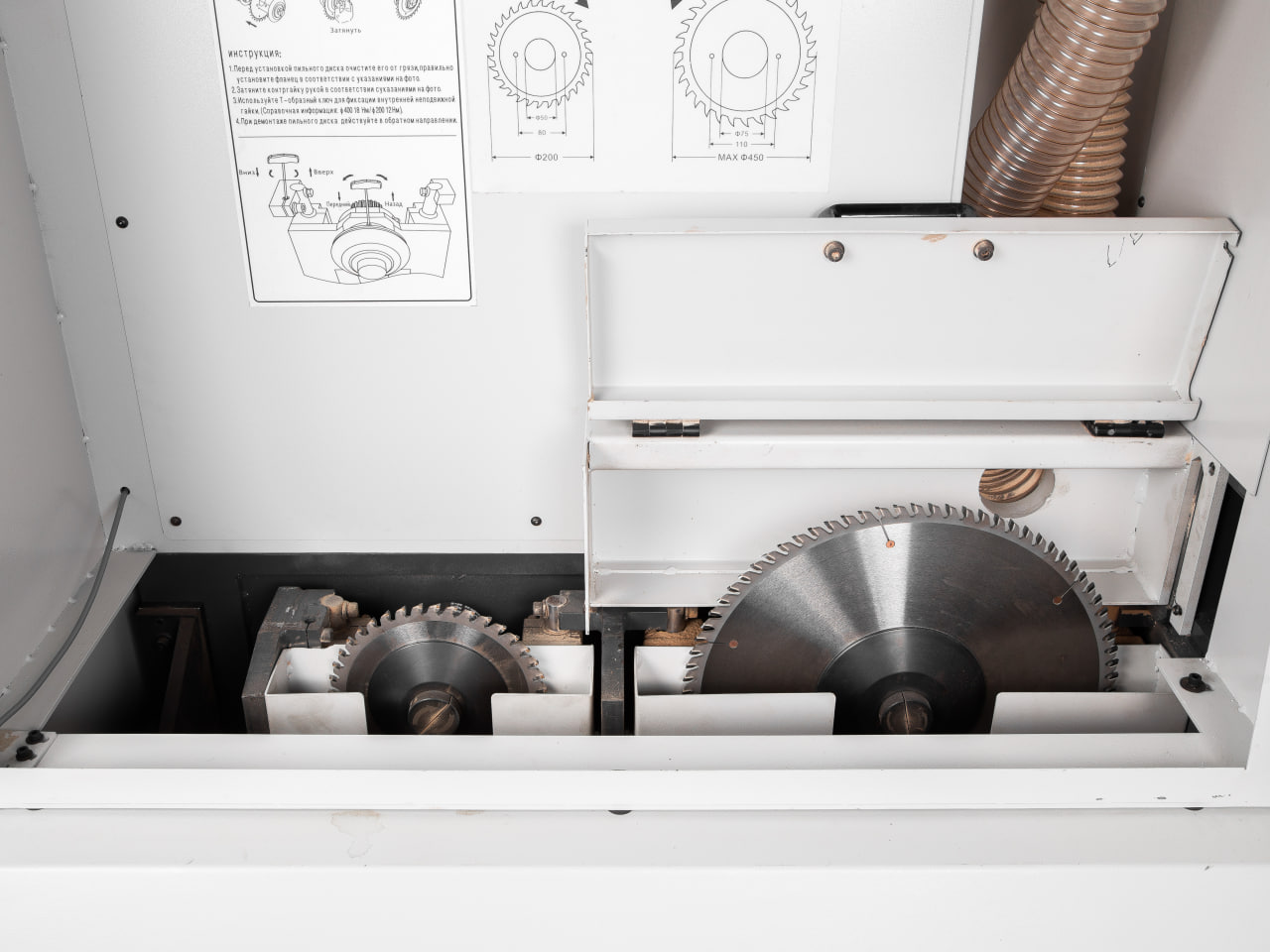 Пильный блок на массивных направляющих оснащен раздельными приводами основного (18 кВт) и подрезного (2кВт) пильных дисков.