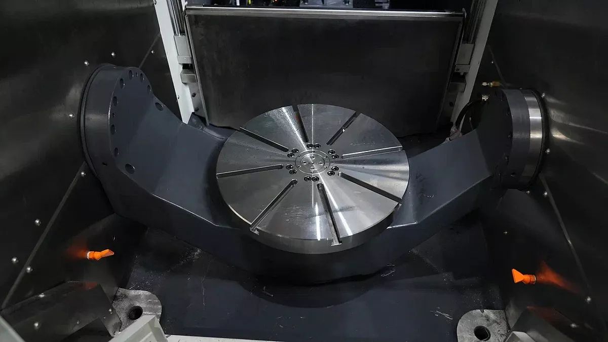 • Поворотный стол прочно зафиксирован на станине на 2 опорах — может двигаться по осям С и А только в поворотно-наклонном направлении.