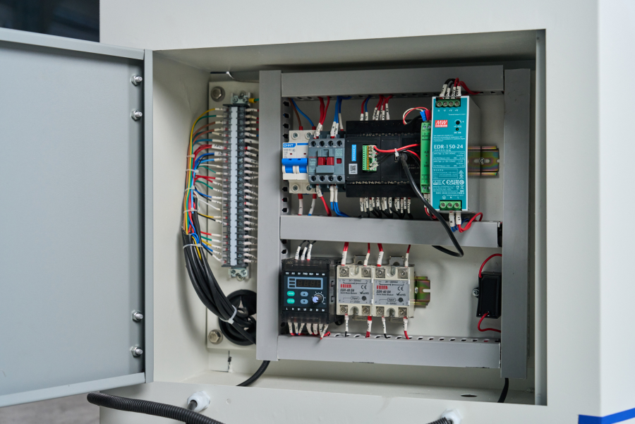 Станок управляется информативным промышленным пультом с сенсорным экраном, позволяющим управлять параметрами обработки, регулировать температурные параметры, регулировать скорость подачи и создавать программы с различными параметрами приклеивания кромочного материала.
