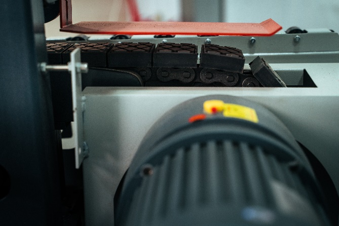 Надежный цепной привод конвейерной лены работает от двигателя 1,5 кВт.