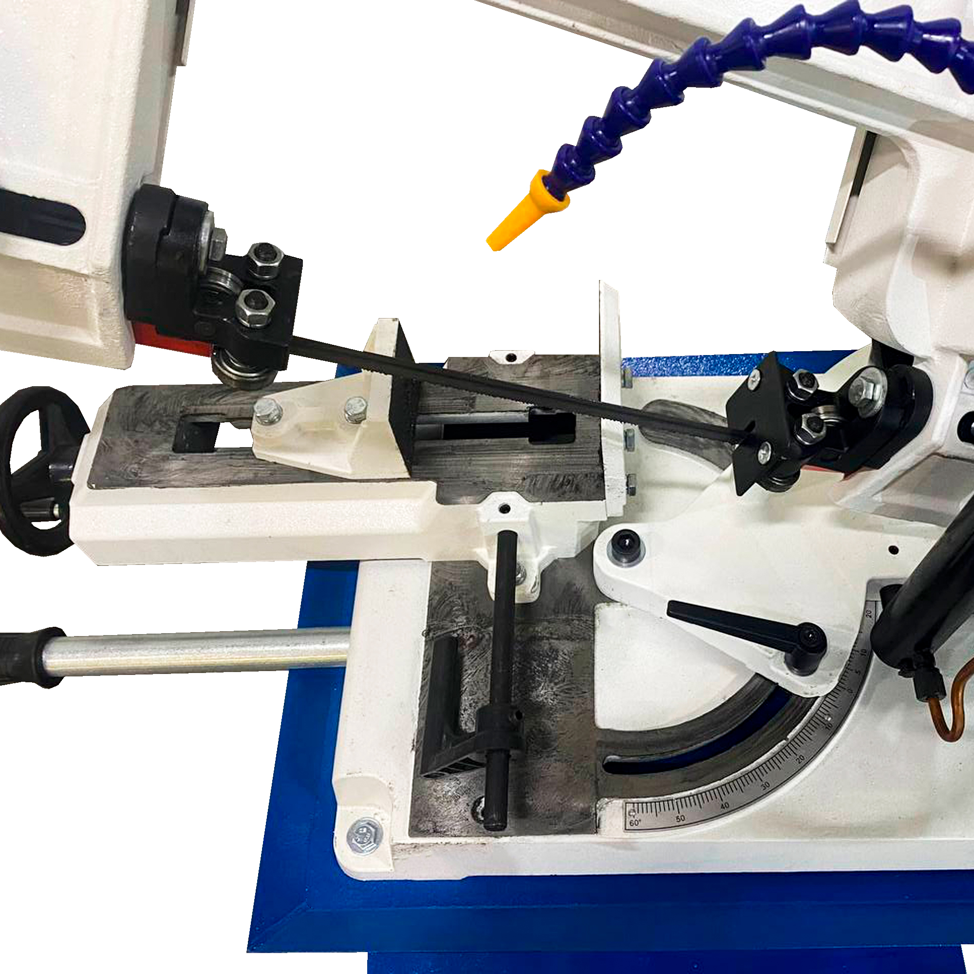 Позиционирование полотна под 90° относительно тисков обеспечивают подшипники, установленные на креплении режущего инструмента. Вылет крепления можно изменять в зависимости от размера обрабатываемой заготовки.