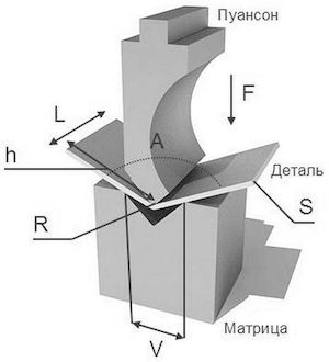 F (усилие, тоннаж), тонн - общее необходимое усилие для осуществления гиба;