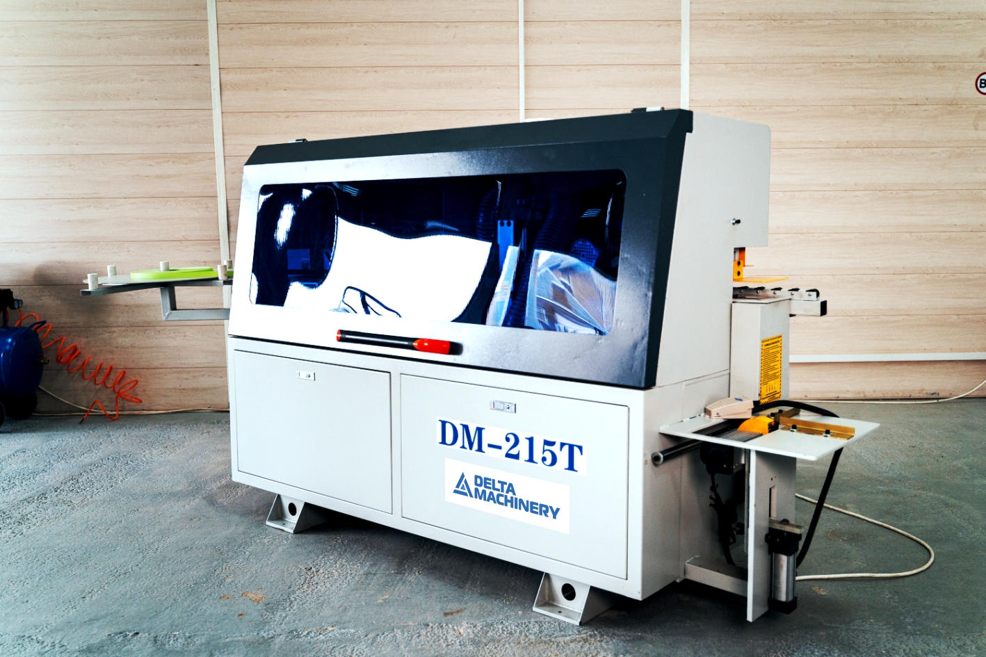 Пневматический торцовочный агрегат с высокооборотистым мотором компактно расположен в торцевой части станка.