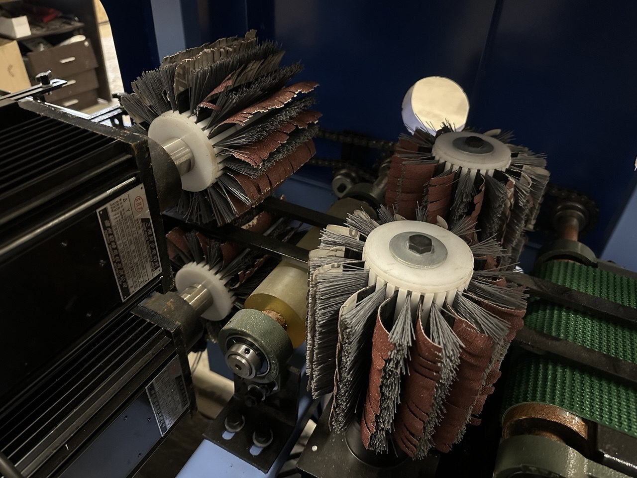 Станок в базовом исполнении оснащен щеточно-шлифовальными барабанами. При необходимости можно укомплектовать ленточно-шлифовальными барабанами (как на фото). Вне зависимости от вида шлифовальных барабанов они будут иметь функцию осцилляции, для более качественной обработки и экономии расходных шлифовальных элементов.