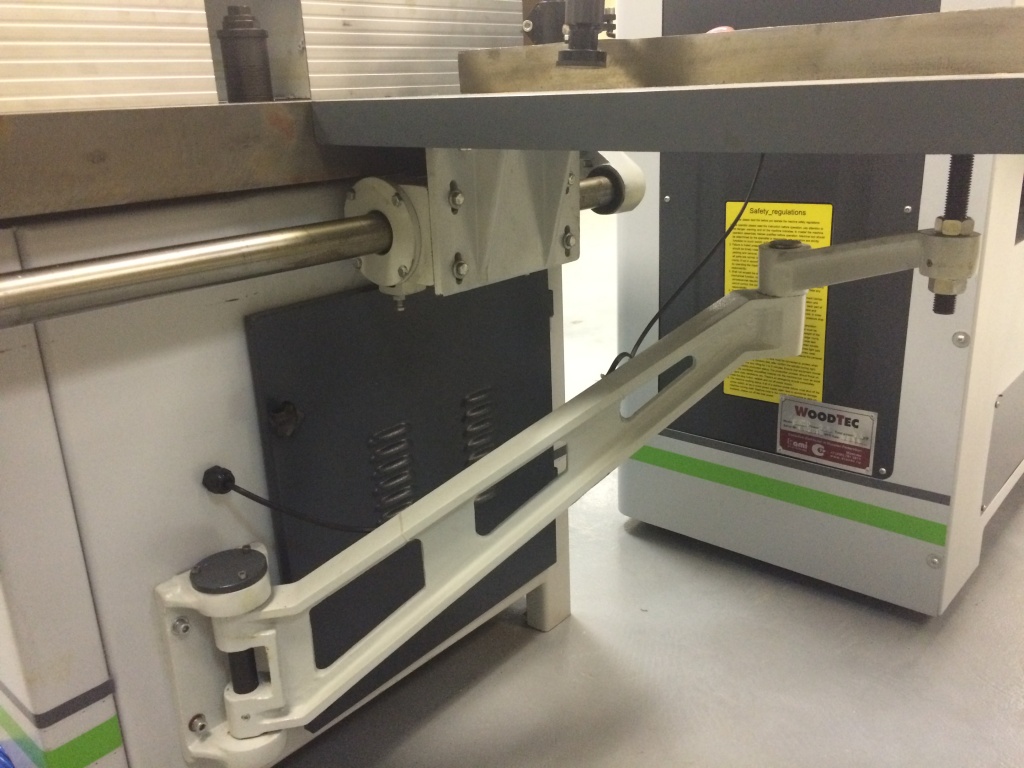 Зарезка шипов и проушин с помощью чугунной шипорезной каретки размером 650 х 350 мм. На каретке расположена кнопка аварийного выключения станка. Базирование заготовки по направляющей.