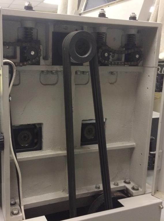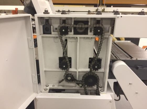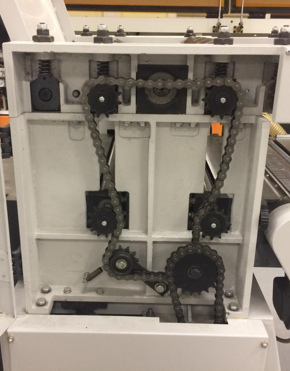 Привод рейсмусового вала, верхних и нижних подающих вальцов осуществляется от мощного двигателя посредством клиноременной передачи и цепей.