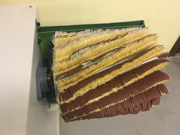 Наклон шлифовальных щеток Наклон шлифовального инструмента позволяет эффективно поднимать и сбивать ворс на заготовке, тем самым обеспечивая идеально качество обработки. Инструмент Шлифовальная секция представляет собой 2 поддерживающие щетки и шлифовальную щетку (при смене инструмента и перехода на другую шероховатость необходим поменять только шлифовальную ленту). |