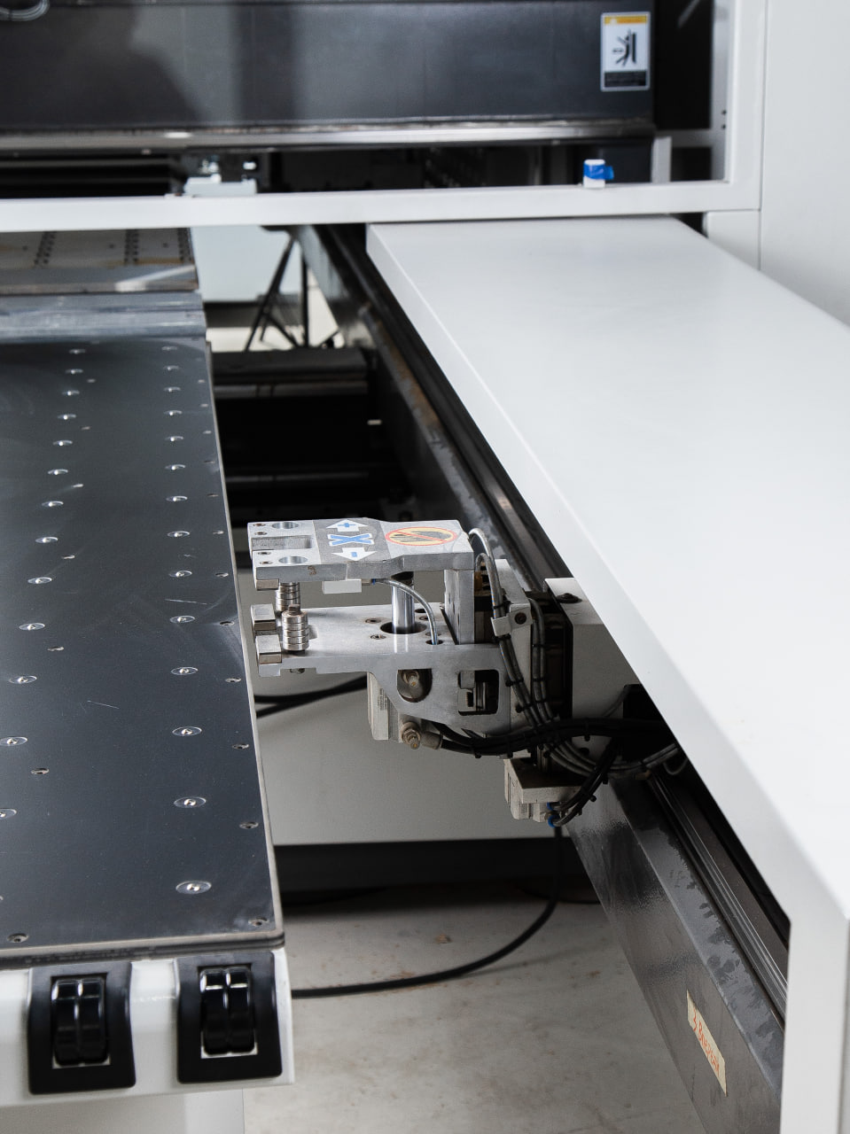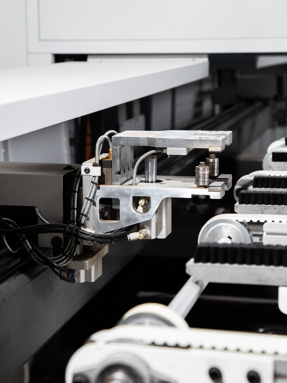 Программно-управляемый боковой упор с обрезиненными роликами для надежного и точного позиционирования детали.