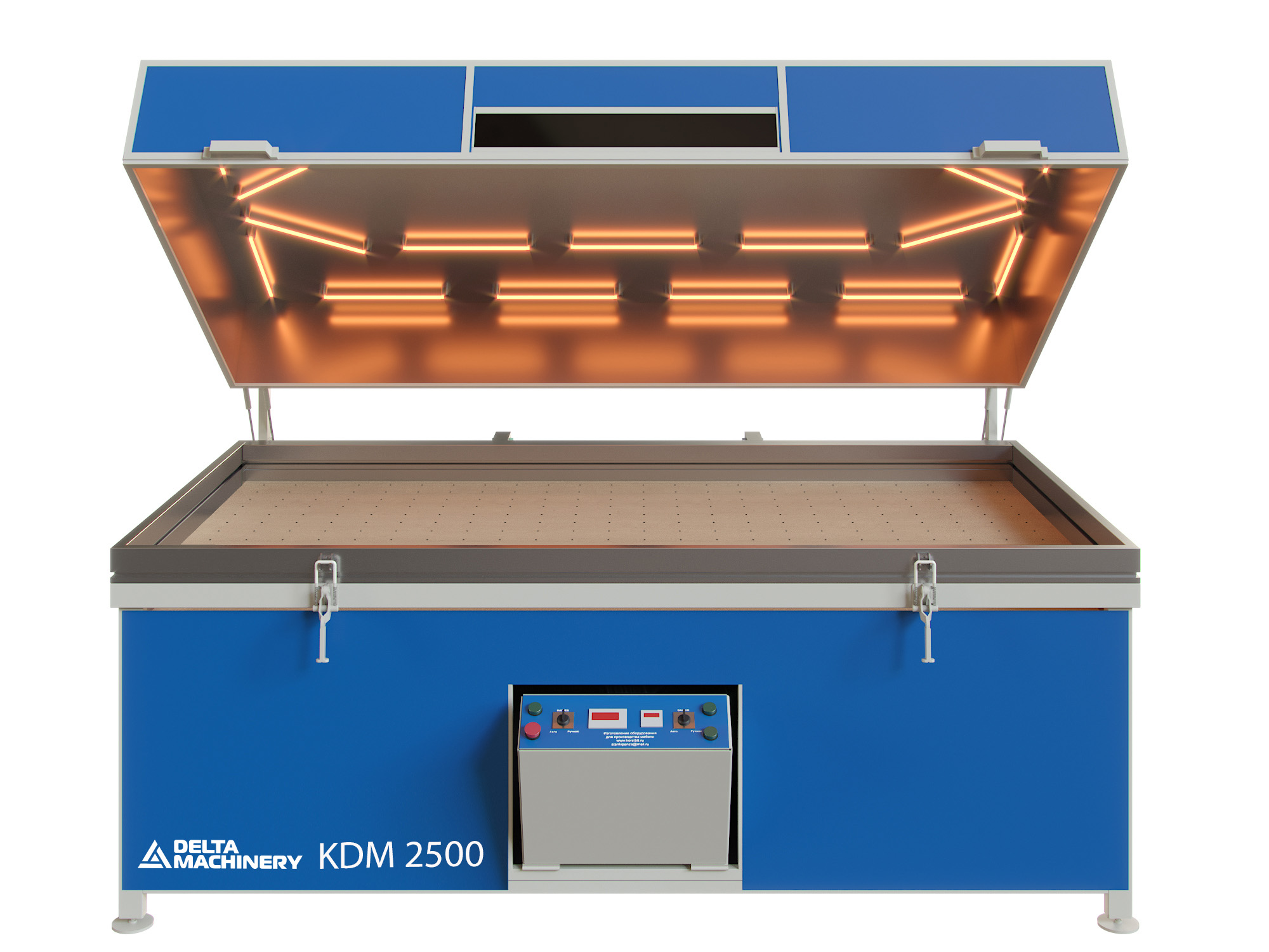 Вакуумный пресс для мебели KDM 2500 – это удобное и эффективное оборудование, специально созданное для облицовки мебельных фасадов (МДФ, ДСП и т.п.) ПВХ плёнками, шпоном, пластиком, текстурированной бумагой.