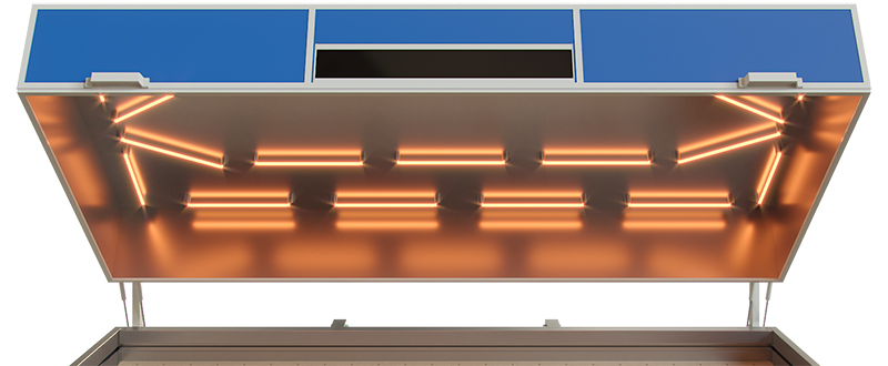 3. Внутренняя обшивка термомодуля со специальным термоотражающим материалом, а также уникальное расположение нагревающих ламп способствуют равномерному прогреву плёнки по всему периметру рабочего поля. В станке используются кварцевые лампы нагрева, блоки которых образуют несколько независимых контуров. Микрокомпьютер управляет нагревом каждого отдельного контура, а это в свою очередь приводит к равномерному нагреву всей плоскости плёнки при условии, что выставлена оптимальная температура. Экраны, которые обладают повышенной отражающей способностью, служат для эффективного распределение теплового излучения, а также значительно снижают нагрев внешних поверхностей крышки.