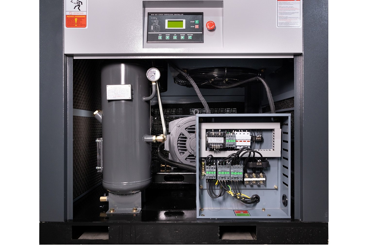 Позволяет автоматически отключать электродвигатель при отсутствии необходимости в его работе, а также задавать требуемые параметры непосредственно с панели управления. Показывает текущие параметры работы компрессора. Вовремя оповещает о предстоящем техническом обслуживании.