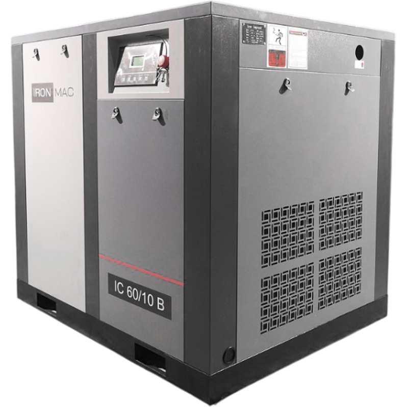 Винтовой компрессор IronMac IC B из основной линейки, собран на прочной стальной раме. Компрессор предназначен для малых и средних предприятий, а все узлы конструкции фиксируются к жесткому основанию и дополнительно изолируются от вибраций. На серии IC B реализована система ременного привода через клиновые ремни, а двигатель имеет уровень защиты от IP 23 до IP 55.